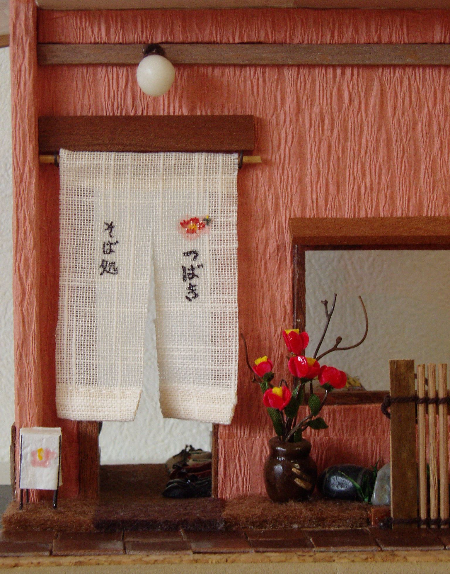 そば処「つばき」 玄関脇に花が生けてあり、門灯とのれんにも椿の花が描いてあります