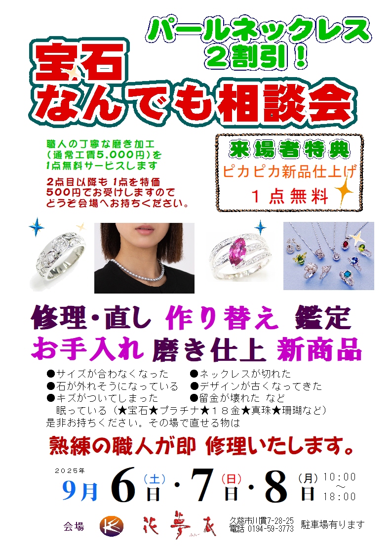 「宝石修理」出来ます、直ぐやります! 2025.09.03 開催日: 2025年9月6日 10:00 AM - 2025年9月8日 6:00 PM 久慈秋祭りももうすぐです。その前に 手持ちの指輪、ネックレスの「お手入れ」はいかがですか? 涼しくしてお待ちしております。 どうぞお出で下さい